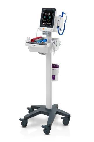 The monitor is simply and securely fastened with a quick-release fastener and can be easily removed, roll stand has basket and holders for disinfectants.